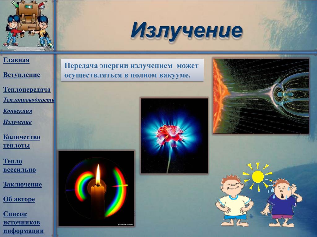 Поднеся руку к источнику света можно ощутить тепло, которое излучают предметы. Такое явление называется .